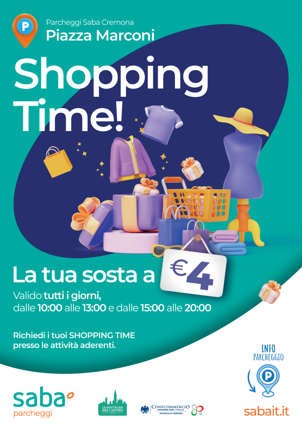 Grazie allo SHOPPING TIME i nostri clienti potranno ritirare presso il negozio un ticket valido per il parcheggio SABA in Piazza Marconi dalle ore 10 alle ore 13 e dalle ore 17 alle 20 del valore di € 4 DA SCALARE dall’importo dovuto per la sosta